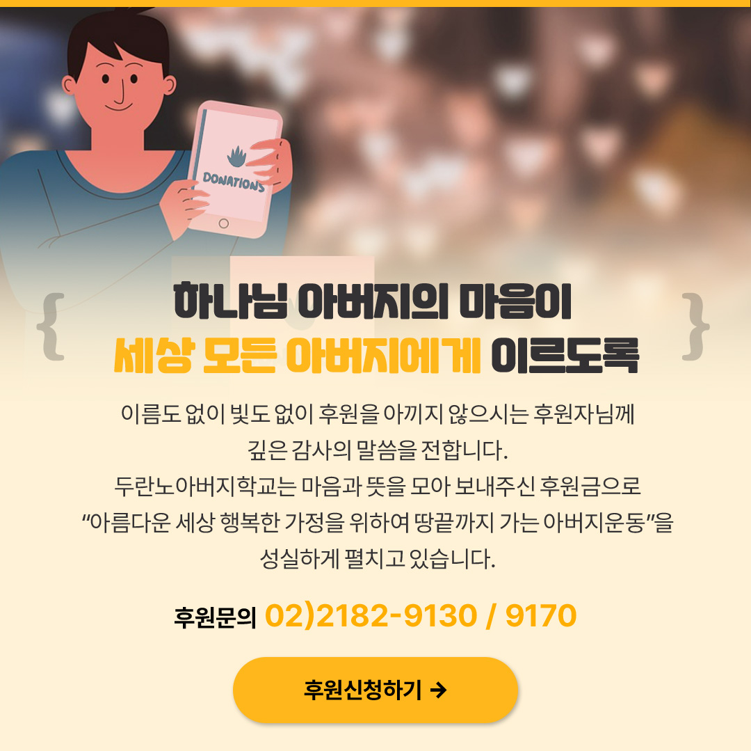 “아름다운 세상, 행복한 가정”을 꿈꾸는 아버지 여러분을 두란노아버지학교에 초대합니다.